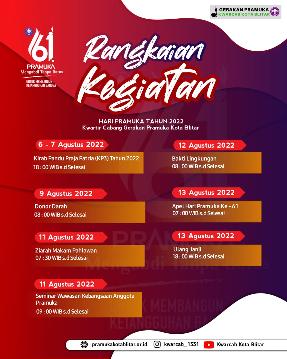 Dalam rangka memperingati HUT ke 60 tahun Pramuka, Gerakan Pramuka Kwaran Kepanjenkidul melaksanakan kegiatan Bhakti Sosial untuk meningkatkan solidaritas dan kepedulian terhadap sesama ditengah...